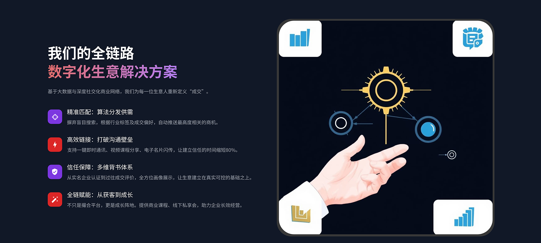 我们的全链路数字化生意解决方案 基于大数据与深度社交化商业网络,我们为每一位生意人重新定义“成交”。 精准匹配:算法分发供需 摒弃盲目搜索,根据行业标签及成交偏好,自动推送最高度相关的商机。 高效链接:打破沟通壁垒 支持一键即时通讯、视频课程分享、电子名片闪传,让建立信任的时间缩短80%。 信任保障:多维背书体系 从实名企业认证到过往成交评价,全方位画像展示,让生意建立在真实可控的基础之上。 全链赋能:从获客到成长 不只是撮合平台,更是成长阵地。提供商业课程、线下私享会,助力企业长效经营。