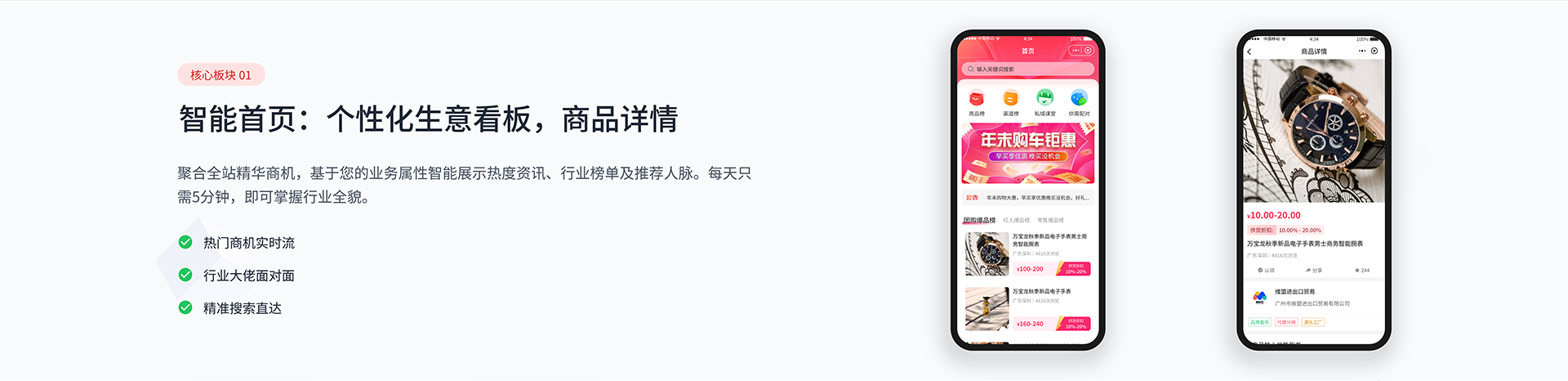 核心板块01 智能首页:个性化生意看板,商品详情 聚合全站精华商机,基于您的业务属性智能展示热度资讯、行业榜单及推荐人脉。每天只需5分钟,即可掌握行业全貌。 热门商机实时流 行业大佬面对面 精准搜索直达