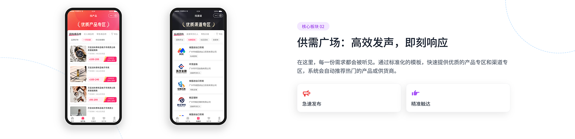 核心板块02 供需广场:高效发声,即刻响应 在这里,每一份需求都会被听见。通过标准化的模板,快速提供优质的产品专区和渠道专区,系统会自动推荐热门的产品或供货商。