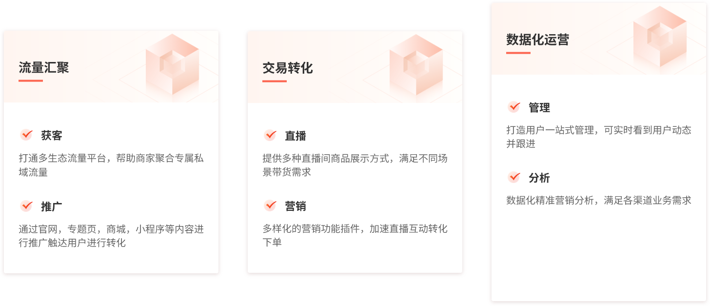 实现直播导购、产品平铺展示、新品发布、商品实时推送,打造品牌专属直播间,满足各类个性化带货场景